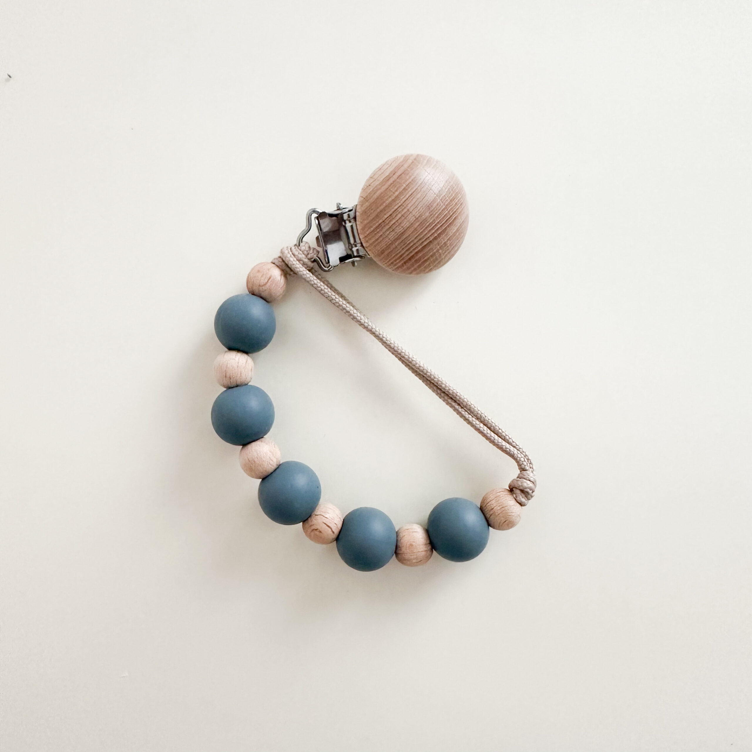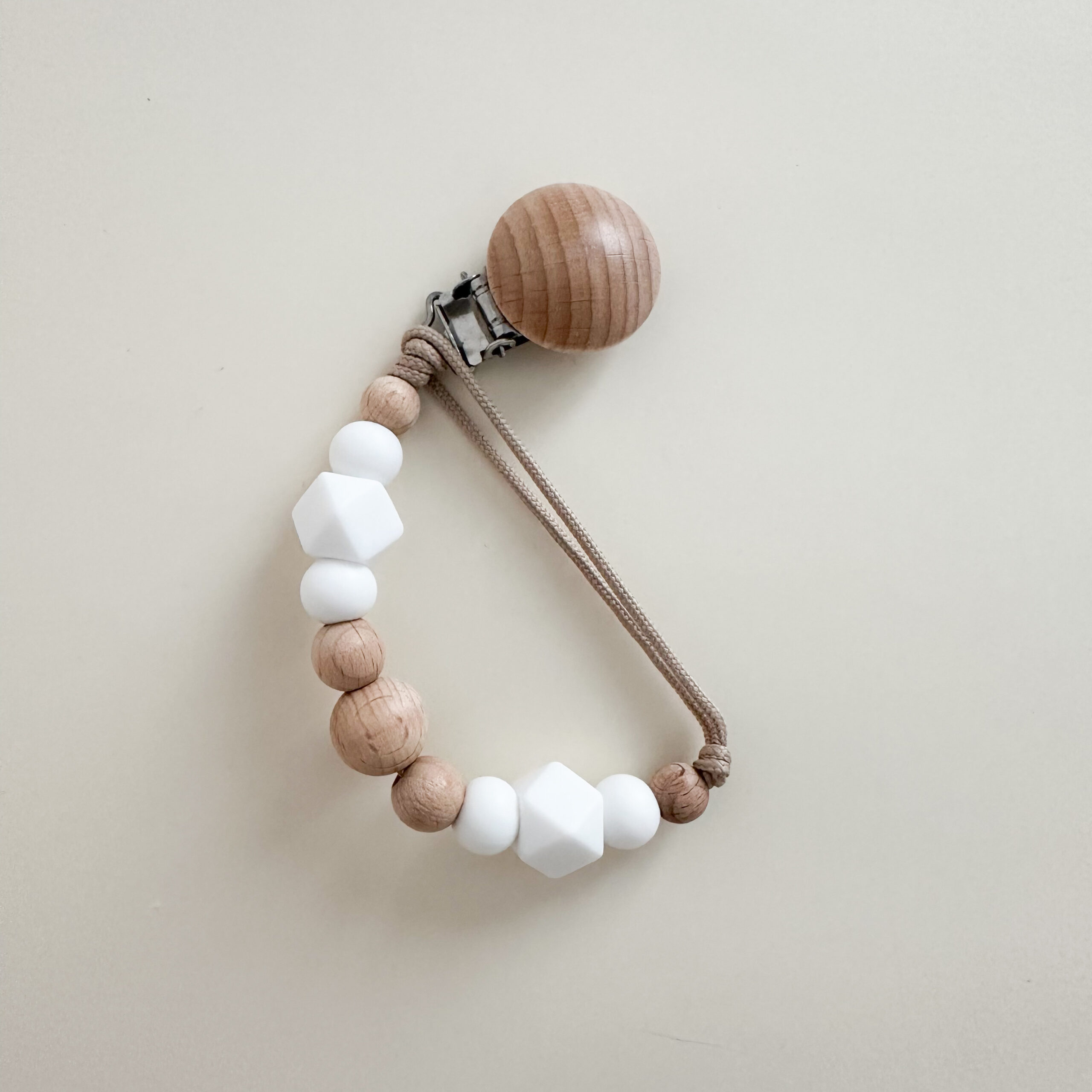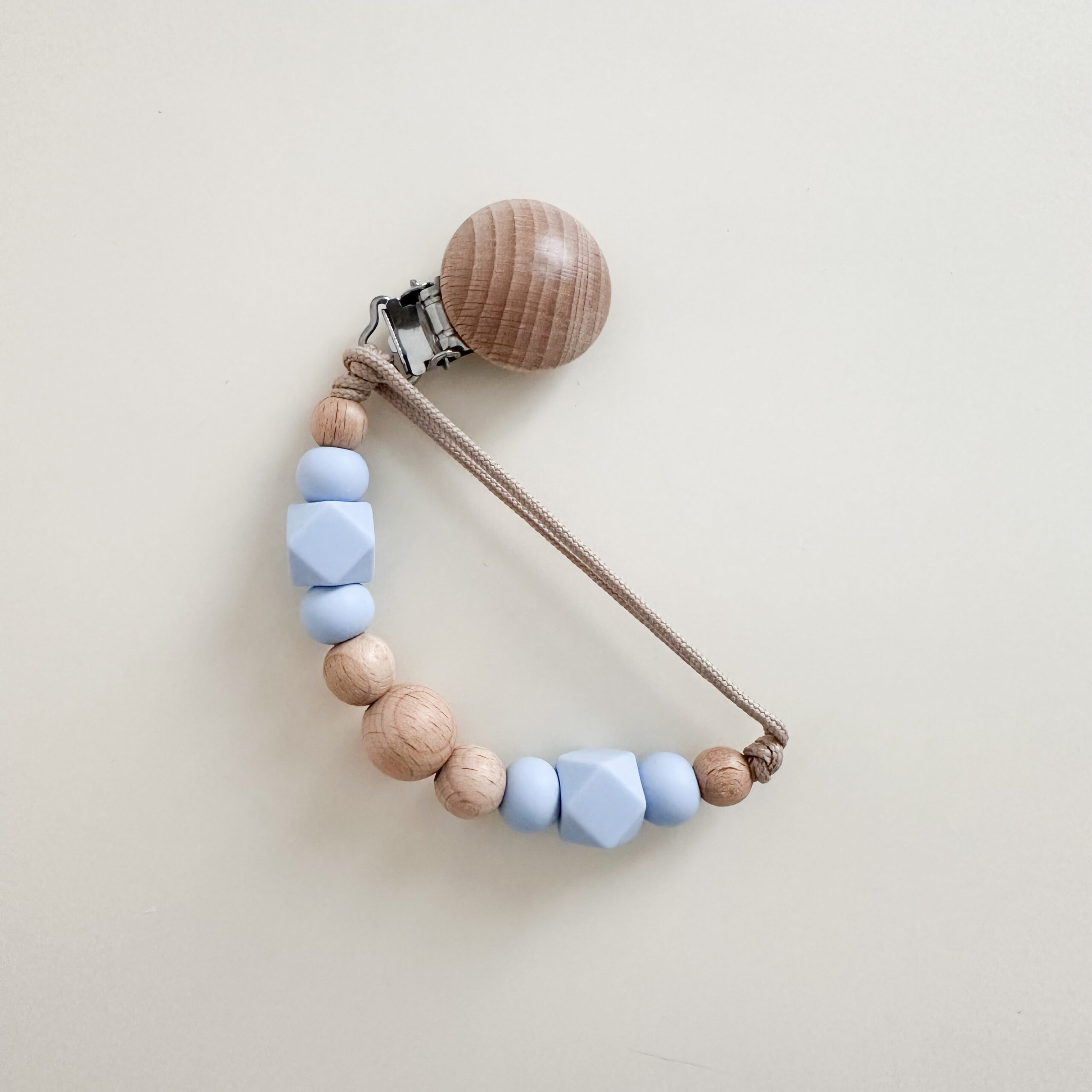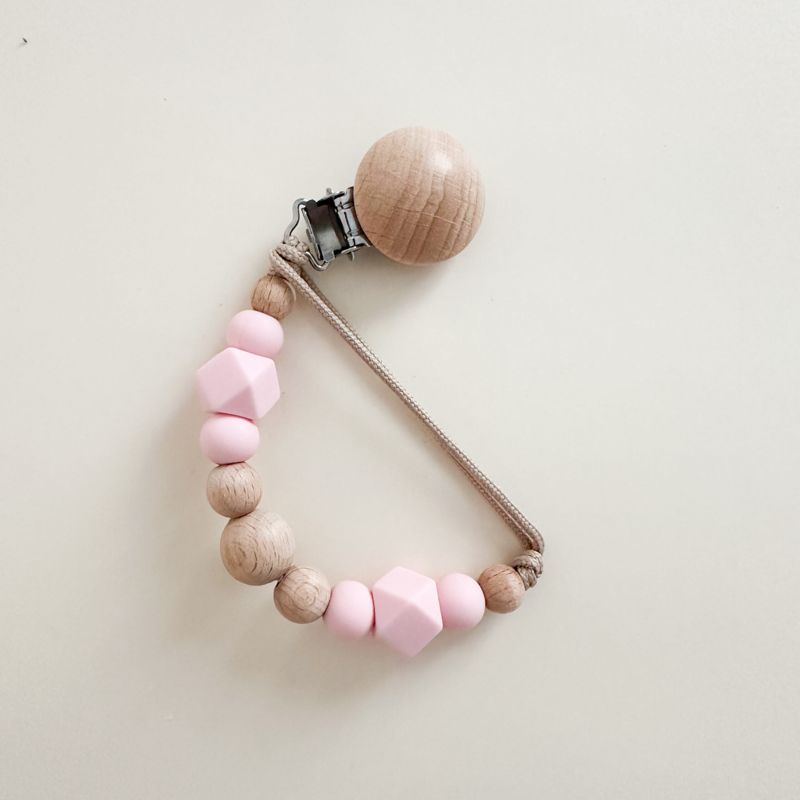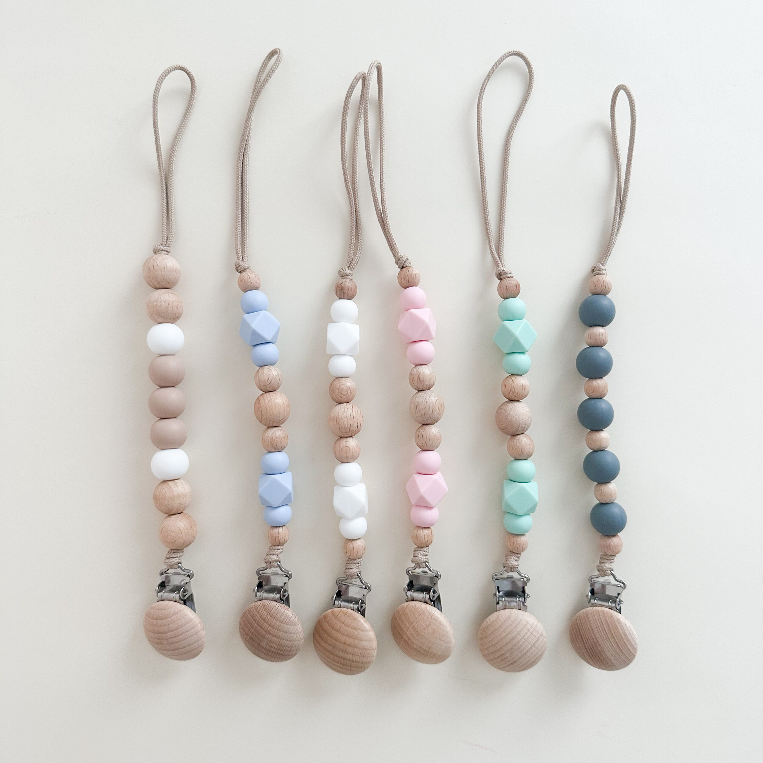 Portachupete con cuentas de silicona antibacteriana y madera natural. Muy práctico para mantener el chupete al alcance del bebé y evitar que se pierda o caiga al suelo.