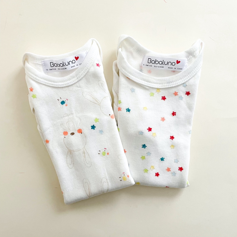 - Conjunto textil para recién nacido, fabricado en 100% algodón. Práctico para usar de pijama o ropita los primeros meses. Incluye pijama y babero.