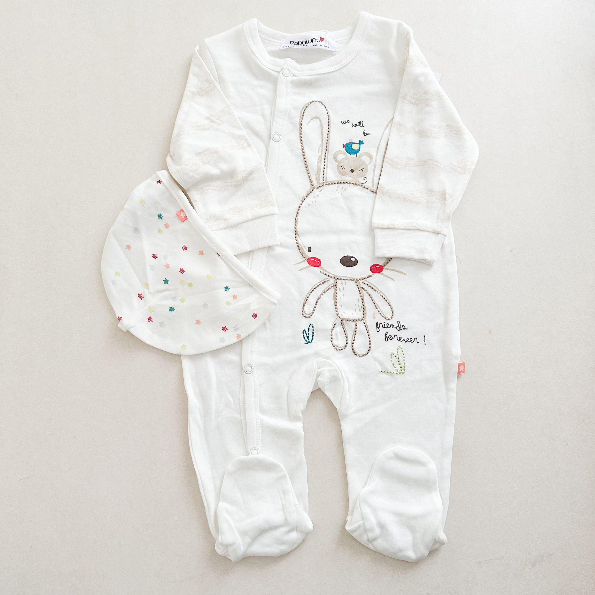 - Conjunto para recién nacido, fabricado en 100% algodón. Práctico para usar de pijama o ropita los primeros meses. Incluye pijama y accesorio (babero o gorrito).