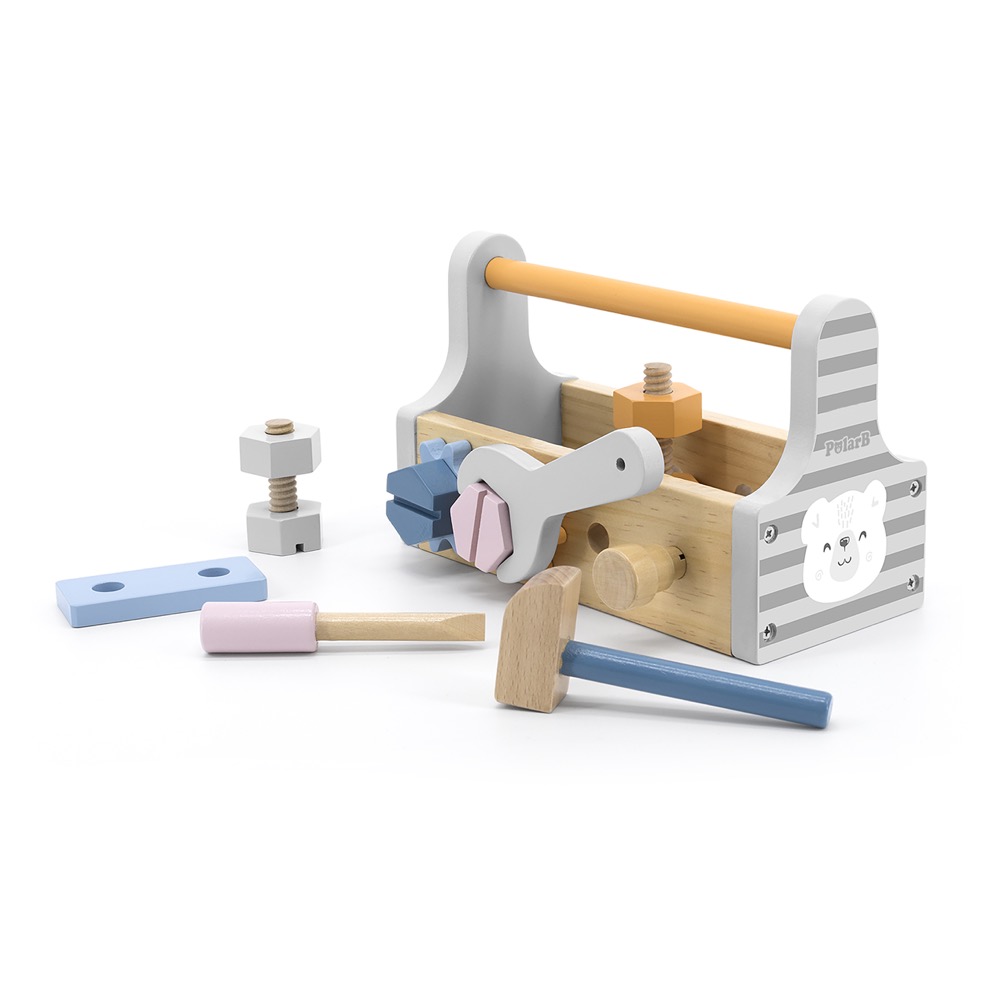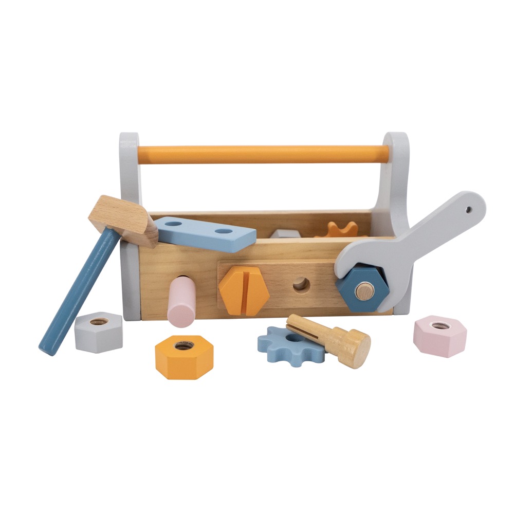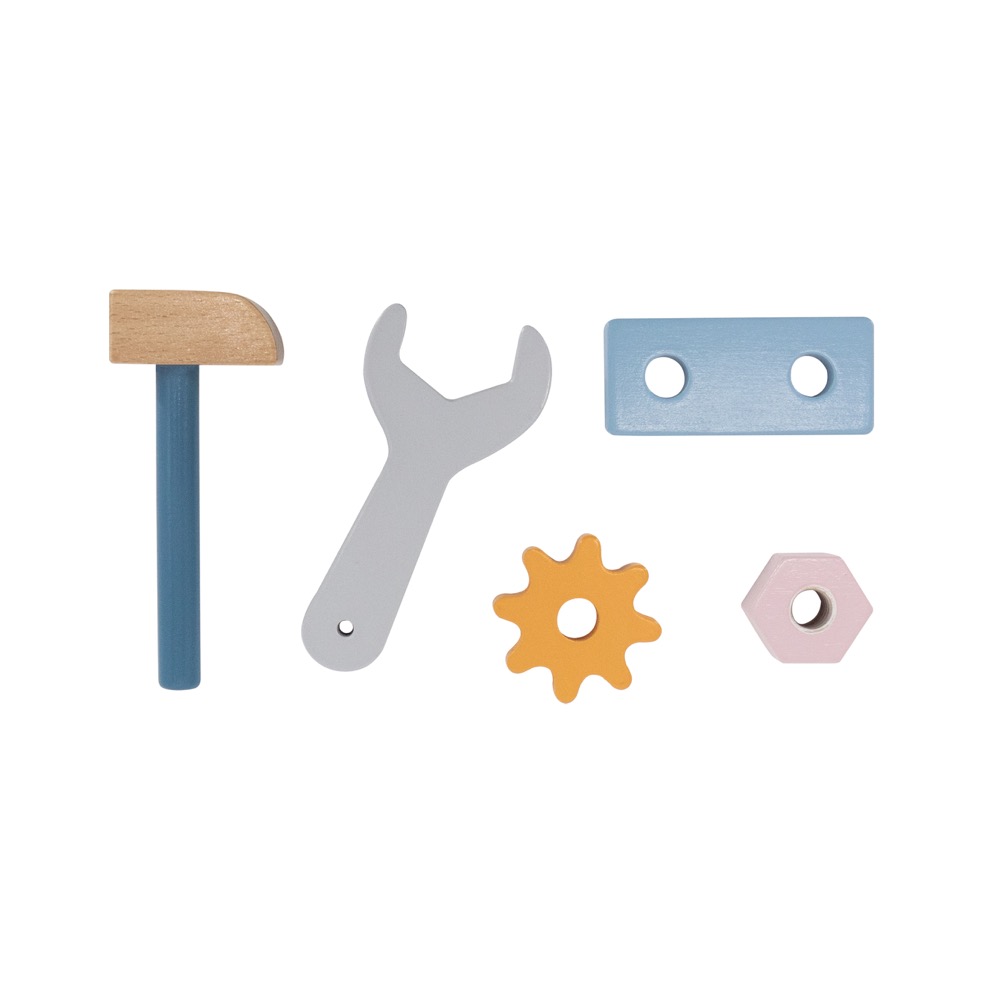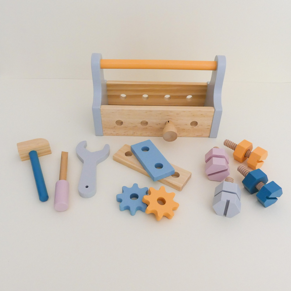 El juego incluye: 1 valija, 1 martillo, 1 llave inglesa, 1 destornillador, 4 tornillos y tuercas, 1 clavija, 2 engranajes. La valija a su vez, tiene orificios para poder encastrar los tornillos. Las piezas están fabricadas en madera de calidad, con bordes lisos y forma gruesa, adecuado para el juego de niños.