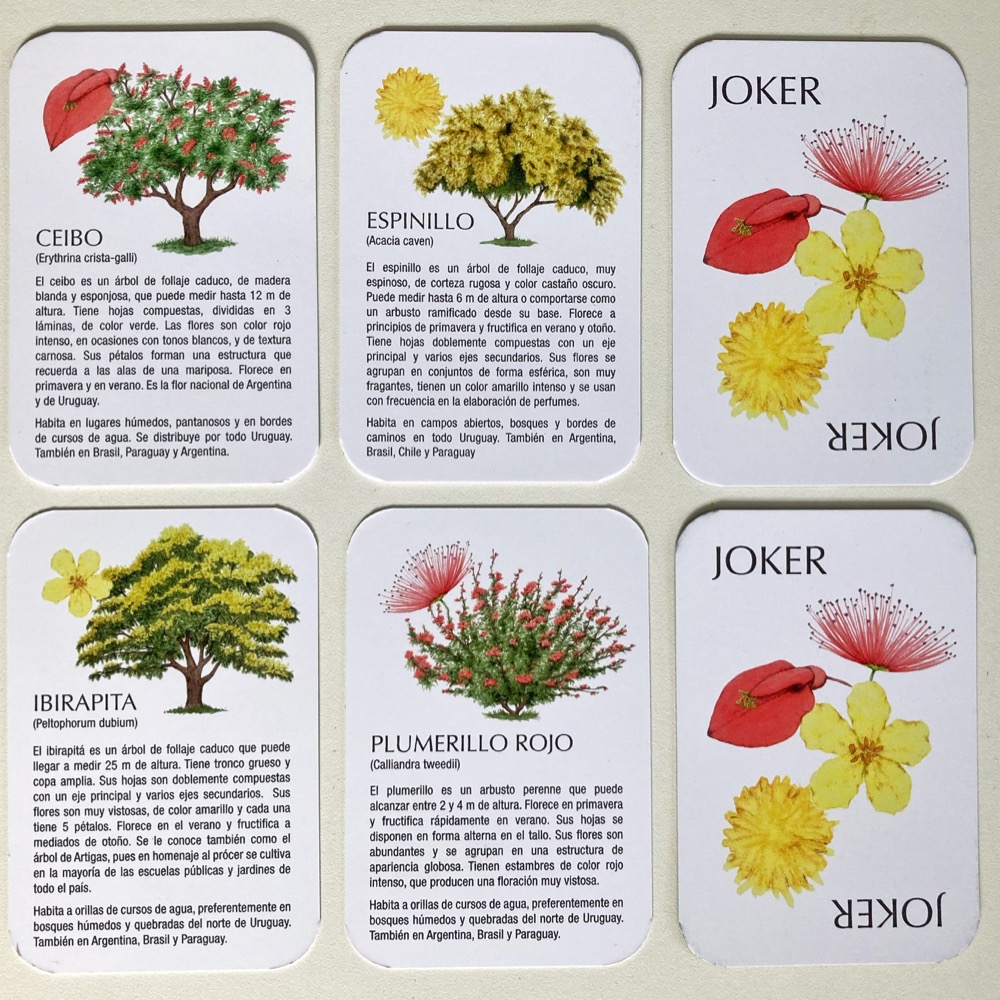 El juego Flora Nativa del Uruguay contiene dos mazos de cartas estilo baraja francesa, con ilustraciones de cuatro especies que fueron elegidas como palos: Ceibo, Espinillo, Ibirapitá y Plumerillo rojo.
